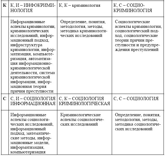 Рассматривая соотношение информатики и криминологии, замечаем, что и та, и другая дисциплины могут вычленить достаточно самостоятельную область исследования: криминологическую информатику и информационную криминологию. Несмотря на синонимичность понятий, есть отличие в подходах, используемых вновь создаваемыми отраслями для решения криминологической проблематики.