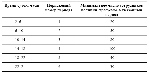 Примечание. Период 1 следует сразу же за периодом 6. Каждый сотрудник полиции работает восемь часов без перерыва.