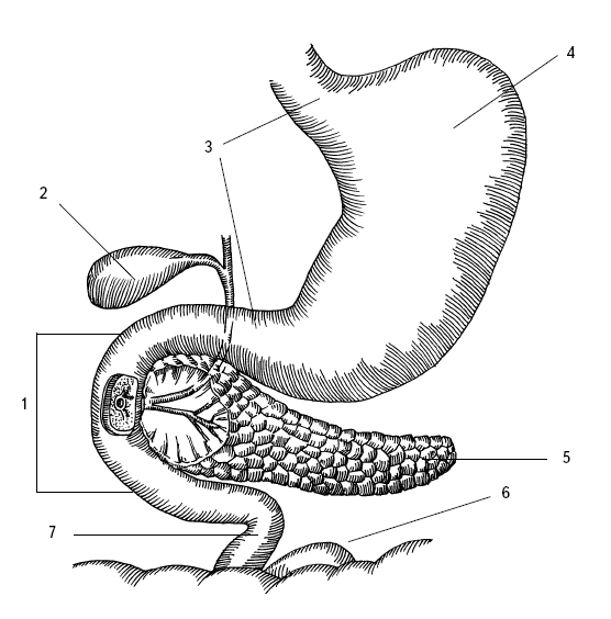 Рис. 2. Строение органов пищеварения:1 – двенадцатиперстная кишка, 2– желчный пузырь, 3– сфинктер, 4 — желудок, 5 — поджелудочная железа, 6 — часть толстой кишки, 7 – тощая кишка (отдел тонкой кишки)
