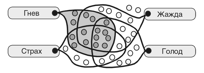 Другой вопрос может коснуться того, что происходит, когда несколько наборов включено вместе – и в итоге некоторые ресурсы оказываются одновременно в возбужденном и подавленном состоянии? Это может привести к психическим состояниям, которые мы характеризуем как «смешанные чувства». Например, когда человек сталкивается с чем-то, определяемым им как Угроза, у него могут включиться одновременно Гнев и Страх.