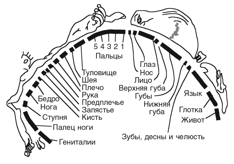«Избавься от меня», – настаивает боль Джоан, но откуда та знает, что болит именно колено? Каждый человек рождается с набором нервов, которые связывают участки кожи с несколькими разными «картами» мозга, как, например, вот эта в сенсорной зоне коры[18].