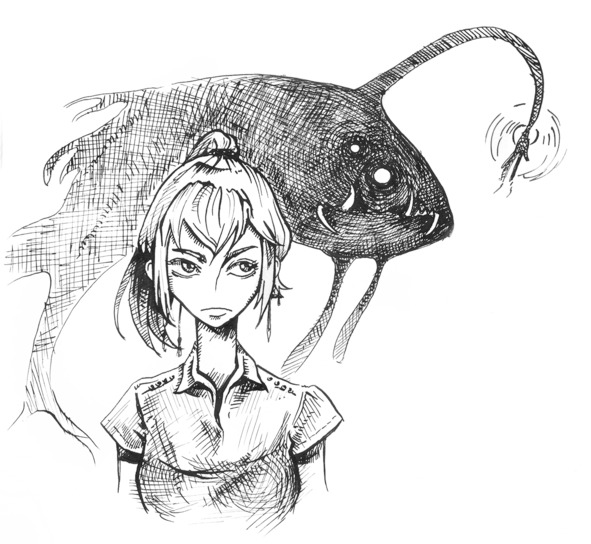 На фоне колышущихся занавесок с глупым рисунком, почему-то вдруг резко выцветших, так же как и стены купе, и столик, и кушетки, зависло… Существо. Оно своей формой напоминало глубоководную рыбу с длинным отростком, росшим прямо из головы, покачивающимся и манящим слабым фосфоресцирующим светом, привлекая к себе добычу.