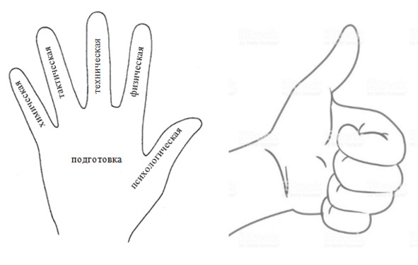 Большой палец запоминается лучше всего и отражает внутреннее состояние, в котором спортсмен хочет находиться перед соревнованием (игрой), во время соревнования (игры) и после его завершения, в период между соревнованиями (играми). Жест с большим пальцем руки, направленным вверх, отражает качество этого состояние. Это и есть психологическая подготовка. Она связана и находится в состоянии двустороннего взаимодействия с физической, технической, тактической и химической подготовкой (большой палец руки соприкасается с указательным, средним, безымянным пальцами и мизинцем) и очень важна.