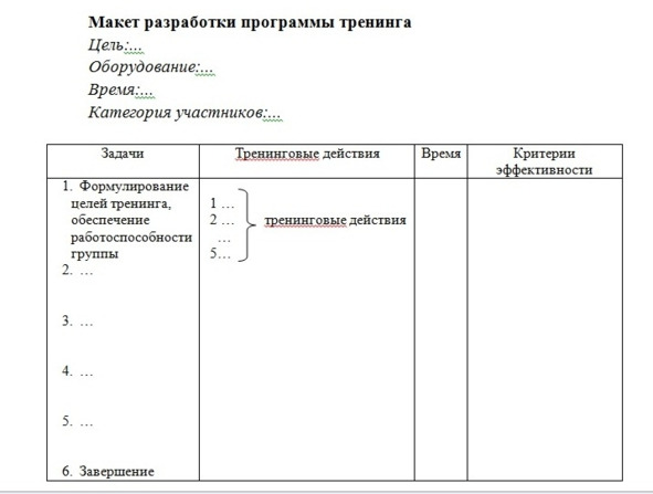 Пример программы тренингового занятия по развитию внутригрупповой сплоченности прилагаю в виде скриншота.