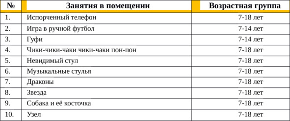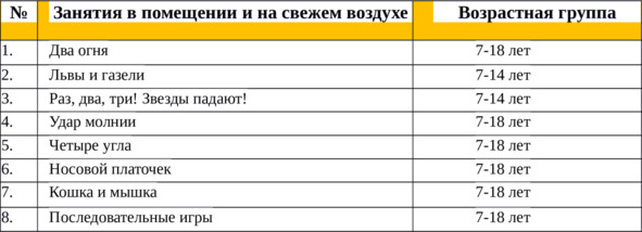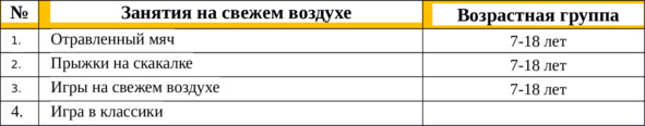 Занятия, проводимые на свежем воздухе – те, которые предусмотрены для больших пространств на свежем воздухе. Их перечень представлен в таблице 2.