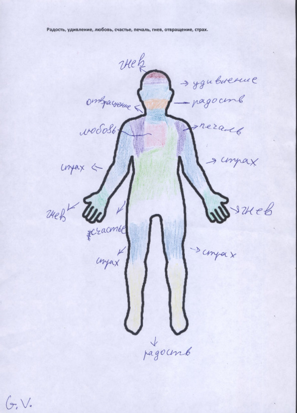 Использовали технику «understanding Emotions». Каждый школьник разными цветами отмечал на листке эмоции, связанные с разными частями тела человека ( рис.1).