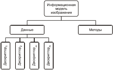 Общее определение информационной модели объекта или явления было дано в разд. 1.1.3. Информационная модель изображения представляет собой совокупность данных, по которым можно однозначно построить изображение, и совокупность методов – операций, с помощью которых можно сформировать и модифицировать эту модель. Структура информационной модели изображения представлена на рис. 1.2.1.