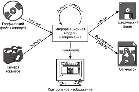 Информационная модель изображения – центральный элемент схемы. Ее состояние постоянно меняется в процессе работы над графическим проектом. Заключительное состояние информационной модели соответствует изображению, являющемуся результатом графического проектирования.