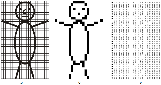 Как в случае с векторной моделью, предельно упростим ситуацию. В простейшем варианте пиксельная модель описывает изображения, в которых присутствуют только два цвета – штриховые (см. разд. 1.1.3). Дескриптор пиксела штриховой модели может принимать только два значения, которые обозначают единицей (цвет штриха) или нулем (цвет фона). На рис. 1.2.6 показаны этапы построения информационной модели штрихового изображения.