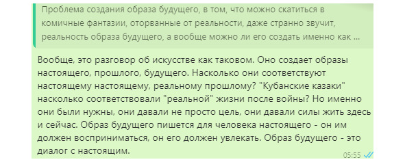 Говорова: Мы очень стремились восстановить связь между поколениями. Именно уважение к старшим задаёт молодым направление в жизни. Не так, что каждое поколение начинает с нуля, а чтобы продолжать дело предшественников. Наставничество задаёт направление общественному развитию и (женщина улыбнулась и положила руки на плечи собеседникам) помогает проявиться инициативе молодых, которым всегда есть к кому обратиться. Мне очень повезло со своей наставницей! Хотя, наверно, так каждый может сказать. Ведь у вашего наставника есть свой наставник – и через эту сеть вам доступны все достижения и открытия человечества.