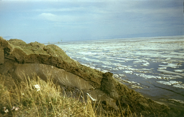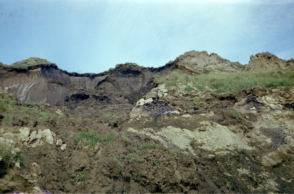 Крутой берег Хатангского залива. Видны обвалы и линзы вечной мерзлоты, лава из грязевого месева