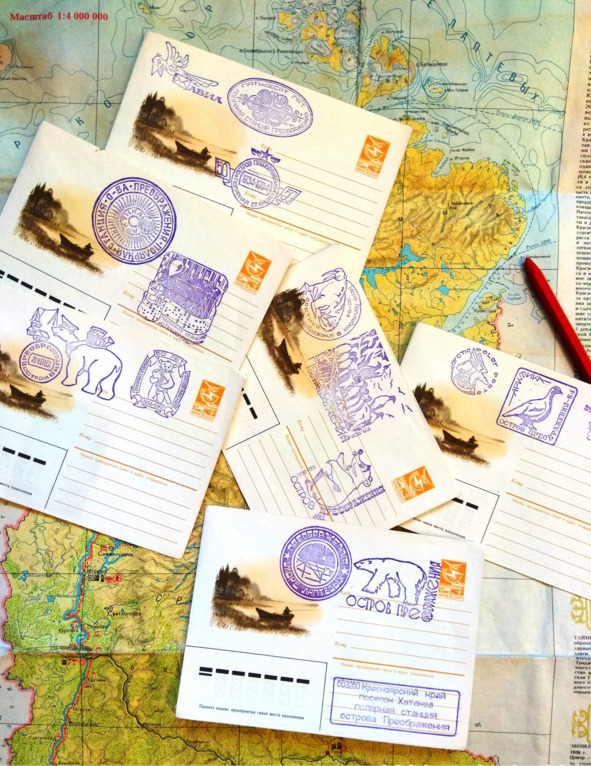 Ребята, прилетевшие с острова Преображения, подарили настоящее свежее яйцо кайры. Птицы Крайнего Севера, похожей на маленького пингвина. Такой птицы на Косистом нет. А на штемпелях полярной станции Преображения изображены птичий базар кайры и сама птица, морж и медведи.