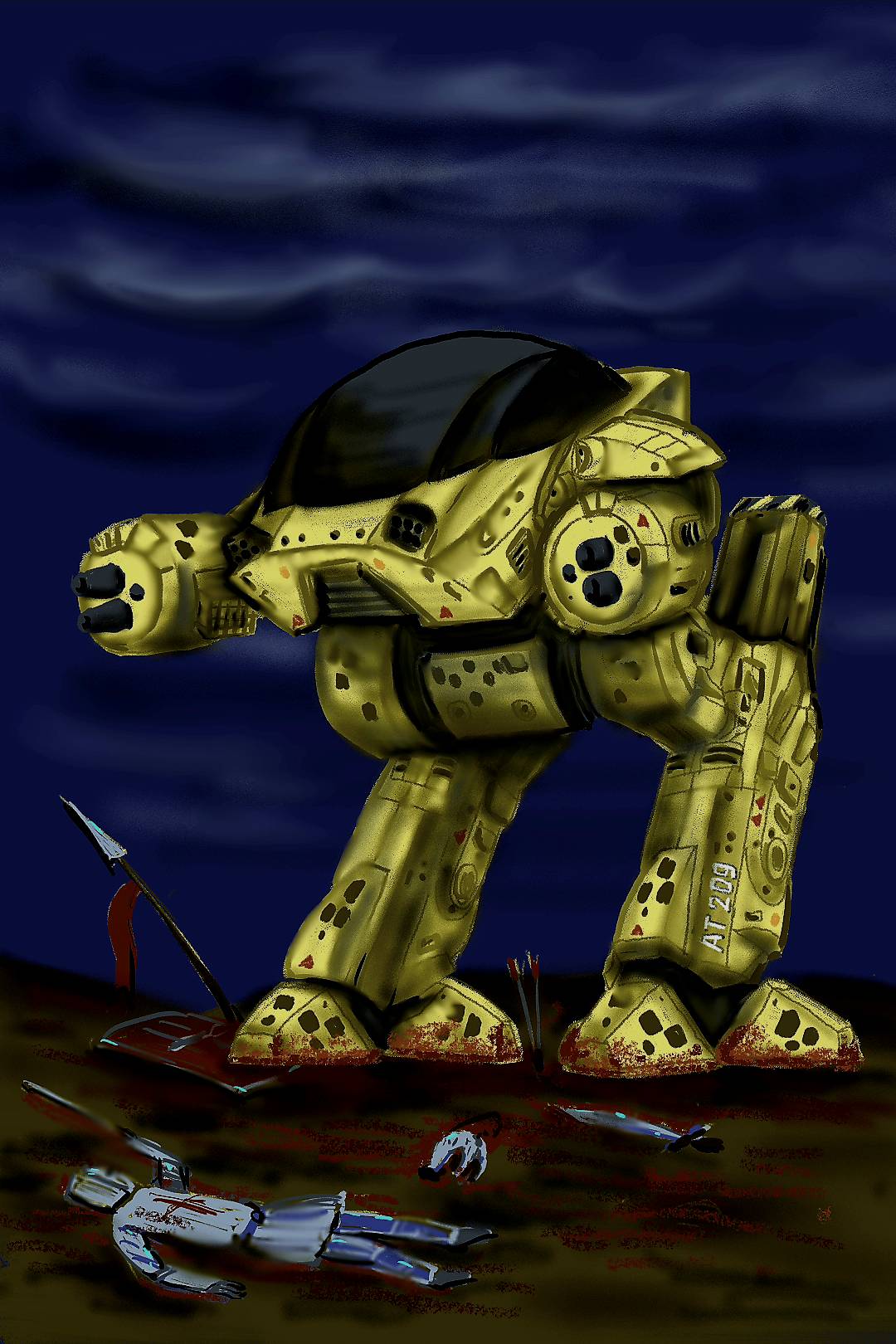 – А-г-р-р-р-р-р! – Беспилотная машина издала громкий низкий гулкий рёв, похожий на рык тигра, и быстро ринулась в сторону противника, несмотря на свои огромные размеры и былую медлительность. Тело робота ритмично раскачивалось из стороны в сторону, пытаясь сохранить равновесие так, как раскачивается тело двуногого существа при беге. Тяжёлые конечности энергично сотрясали землю, оставляя за собой глубокие кровавые следы. На его ногах можно было разглядеть маркировку внутренних войск «АТ» и бортовой номер «209». Поверх бортового номера багровой краской была нанесена растекающаяся надпись: «За императора!». Он стремительно надвигался на толпу вооруженных бойцов в серых костюмах.
