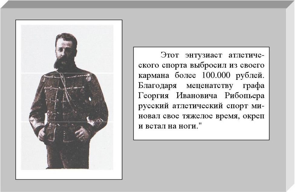 В 1896 году открылось Петроградское Атлетическое Общество, президентом которого был избран граф Георгий Иванович Рибопьер.
