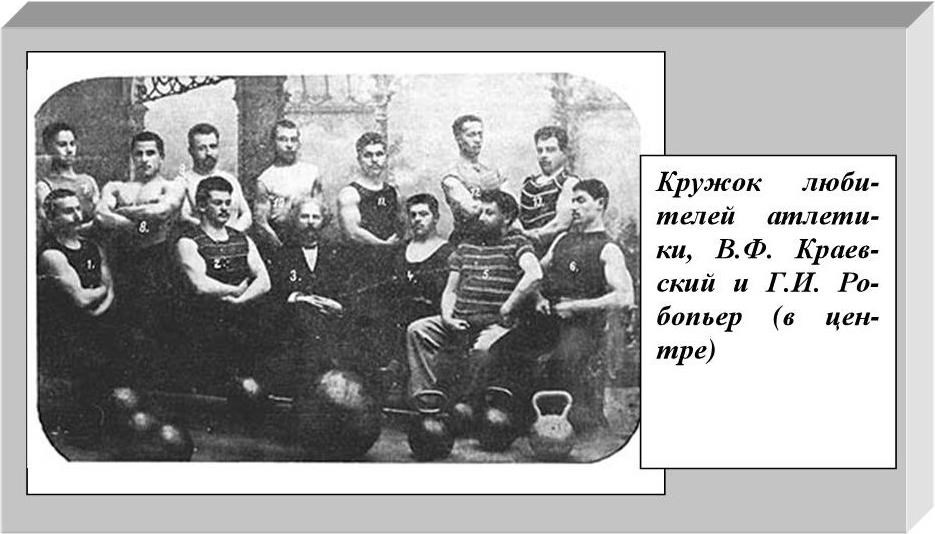 Граф стал посещать кружок Краевского и показывал хорошие результаты. Так, например, он брал с пола на ладони двухпудовую гирю, вытягивал перед собой руку и фиксировал горизонтальное положение руки с гирей. И так три раза подряд. Сдружись со всеми членам Кружка, он принимал деятельное участие во всех спортивных мероприятиях.