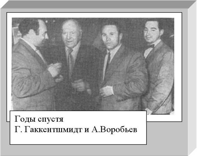 Вдруг отворяется дверь из гостиной и "старик-доктор"вводит за руку какого-то широкоплечего юношу в сером потрепанном пиджаке со словами: "Господа, рекомендую: Гаккеншмидт из Юрьева, так сказать, Звезда Эстляндии!" Надо признаться, что встретили мы гостя не особенно дружелюбно: уж очень ревниво тогда относились к иногородним атлетам. К тому же, мы слышали, что Гаккеншмидт выжимает одной рукой 6 пудов, а в других движениях слаб. Когда он стал раздеваться, мы втайне рассчитывали, что вот-вот "всыпем" юрьевскому атлету. Но только Гаккеншмидт снял пиджак и рубашку, мы так и ахнули: такой мускулатуры ни у одного атлета нам не приходилось видеть! Совершенно без жира, весь рельефный, с бицепсами 44-45 см, с феноменально широкой спиной, покрытой комками мышц "новичок" еще не подходя к штанге одной своей фигурой побил нас всех в пух и прах. Он начал выжимание одной рукой с 200 фунтов ( 1 фунт составлял примерно 400 граммов) – штанги пошли вверх как легкие тросточки…220, 240 и 260 -то же самое! Это был всероссийский рекорд! Трудно описать, что творилось в кружке: Гаккеншмидту кричали "браво", "ура", его качали и т.д. Мы уже не завидовали, прямо осознав, что "новичок" головой выше нас всех. В один из следующих дней Гаккеншмидт выжал одной рукой 282 фунта, побив на 2 фунта рекорд Е.Сандова, считавшийся тогда всемирным…"