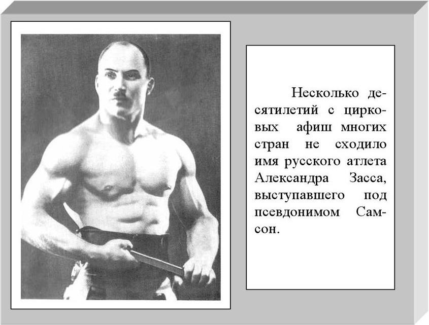 Александр Иванович Засс (Самсон) оставил нам в наследство свою оригинальную систему статических упражнений с цепями, эпиграфом к которой были слова автора: «Мускулы сами по себе не удержат тянущих в разные стороны лошадей, а сухожилия удержат, но их нужно тренировать, их нужно развивать, и способ их укрепления существует».