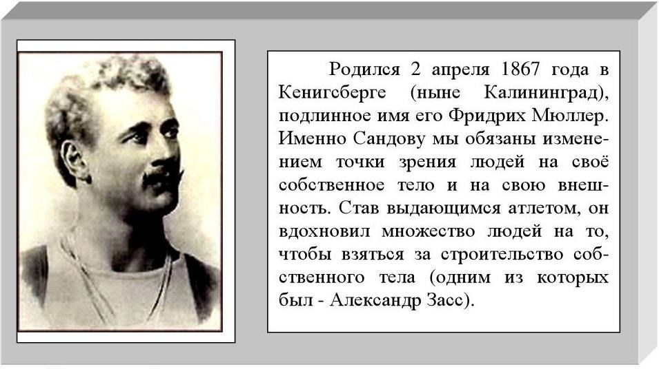 В 1897 году Сандов выпустил книгу "Сила и как её добиться". А год спустя вышел первый номер спортивного журнала. Это издание дало толчок появлению множества других подобных журналов, в том числе и в России.