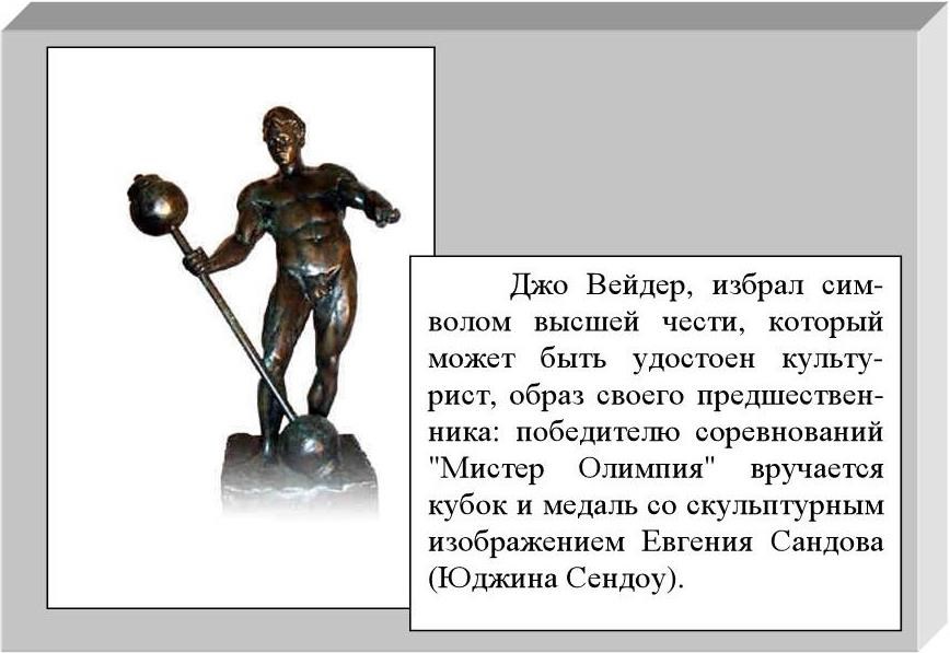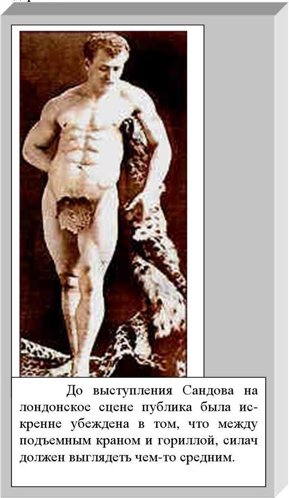 Систематическими, а главное продуманными занятиями с тяжестями Сандов сумел достичь физического совершенства. Наряду с рекордными достижениями он стал обладателем античной фигуры, которая до сих пор служит образцом красоты и гармонии.