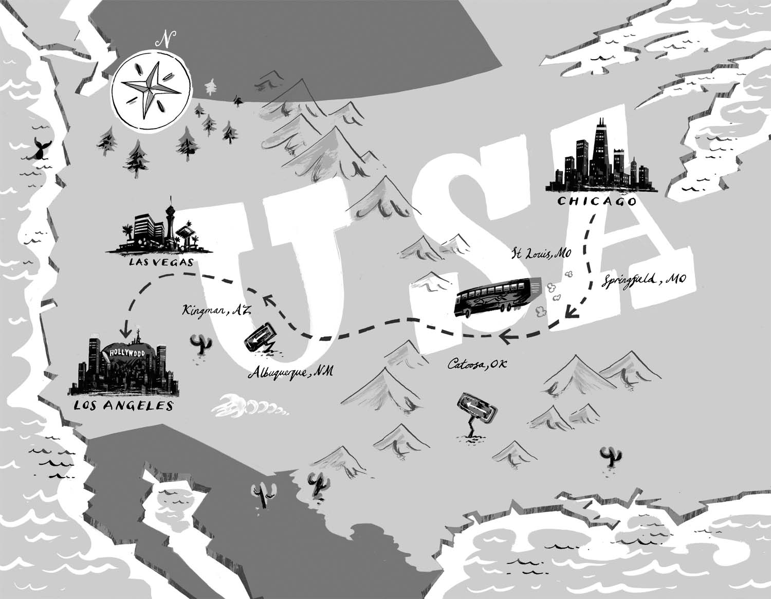 The plane descended. The clouds broke. America spread out like a tablecloth. But one from a black-and-white film. Because Amy had been right about the snow – it covered everything and what it didn’t cover was concrete. There were no skyscrapers, no yellow taxis. The US of my imagination had looked more exciting. Here there was grey. And there was white. And that was about it.