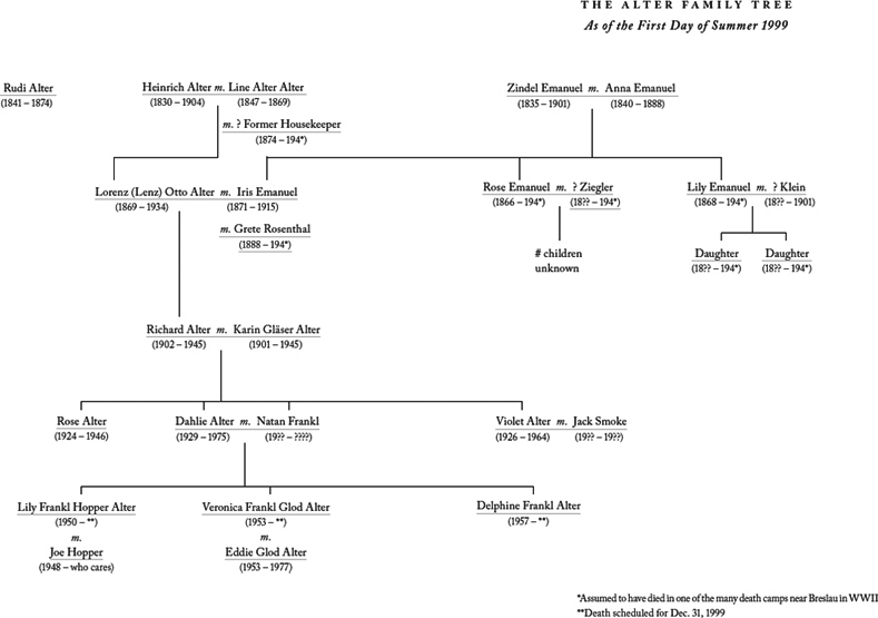 Our subject is the last four generations of Alters, up through and including our own. We plan to record all the sorrows and stumbles as well as all the accomplishments and contributions. We’re sorry to say there’ve been many of the former, far fewer of the latter. This is especially true when it comes to our own generation. We’re the entirety of the fourth generation; we’re the last of the Alter line; we’re “that’s all there is, there ain’t no more”; and we’ve brought the family name no glory.