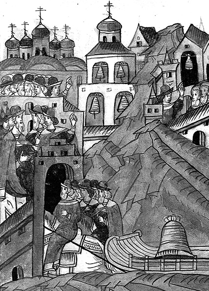 Увоз вечевого колокола. Миниатюра Лицевого летописного свода. XVI в.