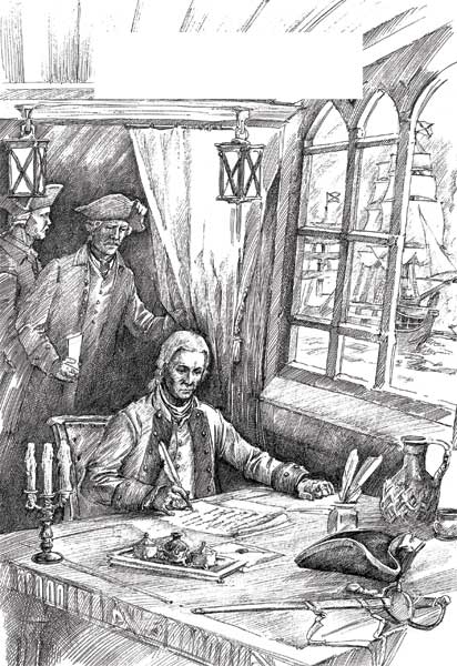 Век XVIII, июль 1770 года. Российский корабль «Три иерарха» с кейзер-флагом на мачте. Алексей Орлов пишет письмо брату Григорию о результатах Чесменской битвы