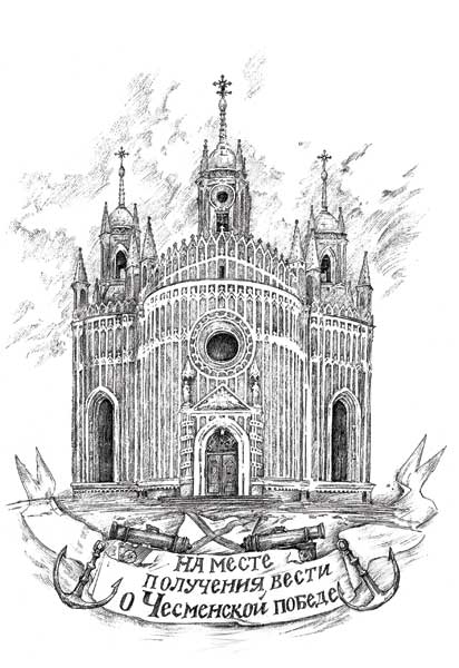 Известие о чесменской победе застало императрицу по пути на царскую дачу, что на седьмой версте Царскосельской дороги, – в один из путевых дворцов, какие строились на дорогах, чтобы Екатерине было где остановиться на привал и отдохнуть. Известие мог доставить и обычный курьер. Но, по преданию, нагнав здесь кортеж императрицы, бросил самодержице под ноги захваченный русскими моряками в Чесменском сражении флаг турецкого линкора «Родос» князь Юрий Владимирович Долгоруков, сам участвовавший в этой баталии. На сём месте Екатерина и распорядилась в честь знаменательного этого события заложить церковь во имя святого пророка Иоанна Предтечи, которую стали называть Чесменской. Освятят церковь, построенную по проекту Ю. М. Фельтена, к десятой годовщине чесменской победы, и на церемонию освящения императрица явится в морском мундире.