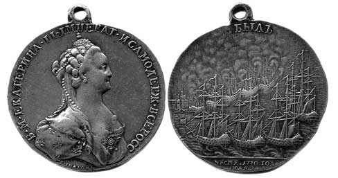 В память события была выбита медаль, изображавшая, с одной стороны, портрет Екатерины II, а с другой стороны – горящий турецкий флот.