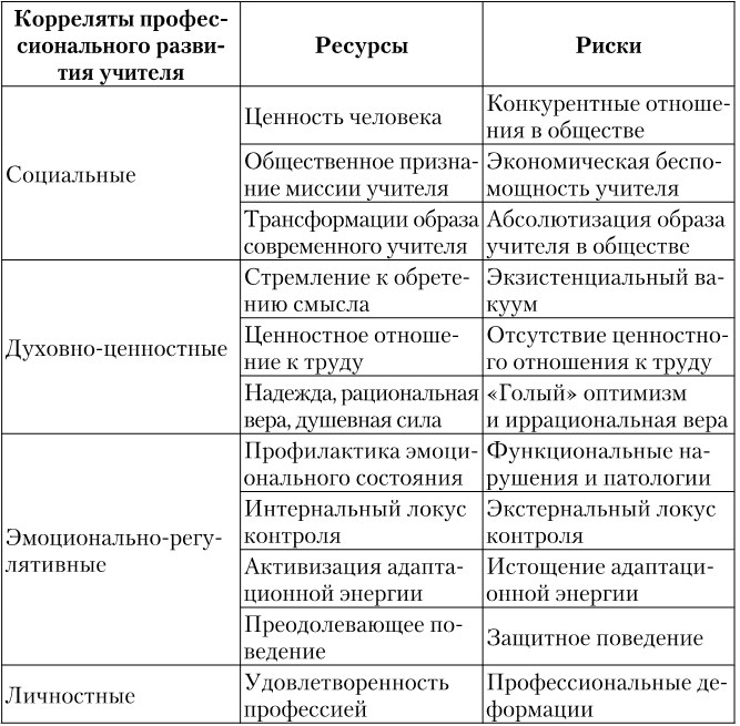 В психологических исследованиях ресурсы и риски профессионального развития учителя представлены полюсными социальными, духовно-ценностными, эмоционально-регулятивными и личностными коррелятами. При этом положительные корреляты рассматриваются в качестве ресурса, а отрицательные определяются как риски. В сгруппированном виде эти корреляты представлены в табл. 1.