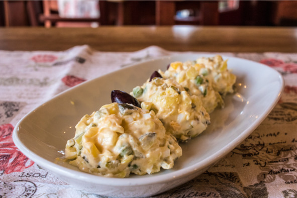 А есть еще и мыжска салата, то есть, мужской салат. Все то же самое, только нарезано крупнее. Видимо, при такой нарезке старый добрый столичный салат приобретает свойства афродизиака.