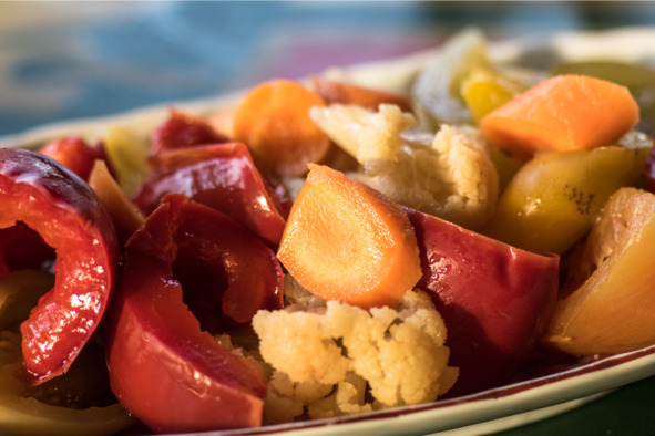 В Болгарии есть две холодные закуски, которые едят только зимой и принципиально не употребляют в другие времена года. Это кисело зеле – квашеная капуста и туршия. По большому счету, это ассорти болгарских маринованных овощей. Три вида присутствуют обязательно – цветная капуста, морковь и разноцветный сладкий перец. Кроме того, в туршию добавляют зеленые помидоры, кабачки, бамью, зелень, черный перец – кто во что горазд.