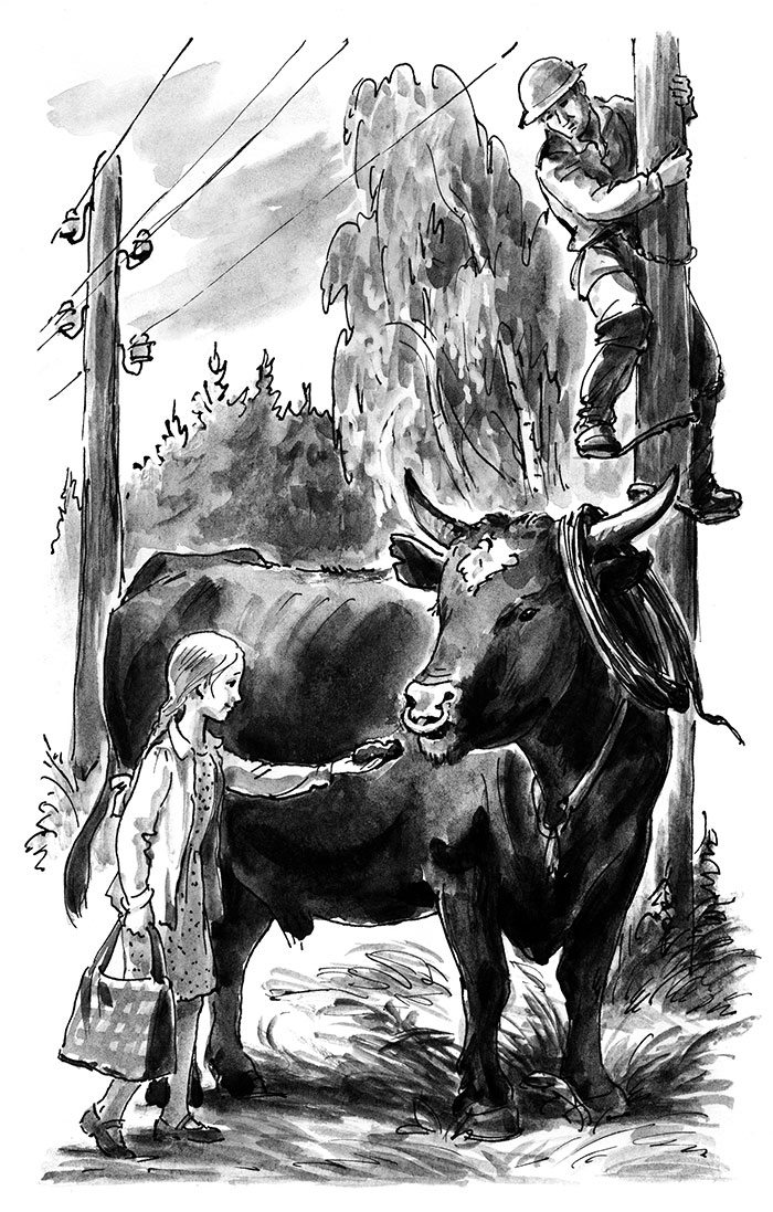 Вот случай! Надо на другой столб лезть, срочно связь налаживать, да как на землю сойти? Крикнул дядя Вася строгим голосом, моток проволоки бросил на Козыряку, чтобы пугнуть скотину, ударил тот моток быка по голове и повис на рогах. Заревел Козыряка, уперся башкой в столб, хочет избавиться от проволоки, а не может и наливается яростью.