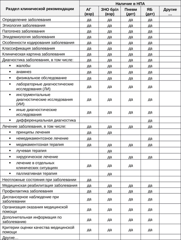 Сравнение основных разделов клинических рекомендаций (КР), фактически представляющих собой верхнеуровневую структуру клинической проекции сегмента системы здравоохранения, приводится в таблице 6.