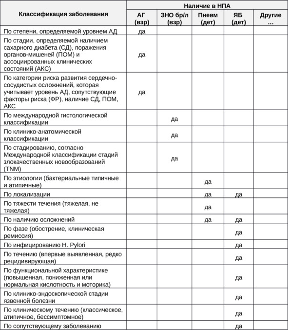 Варианты классификации заболеваний, описанные в вышеперечисленных клинических рекомендациях, представлены в таблице 7.