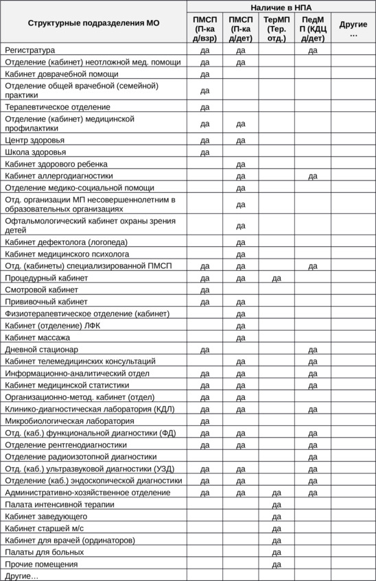 Рекомендованная организационная структура МО – рекомендованное количество структурных подразделений медицинской организации (отделений, кабинетов), для организации и распределения человеческих ресурсов (сотрудников МО), достаточных для оперативного и качественного выполнения всех задач, решаемых МО при оказании определенного вида медицинской помощи.