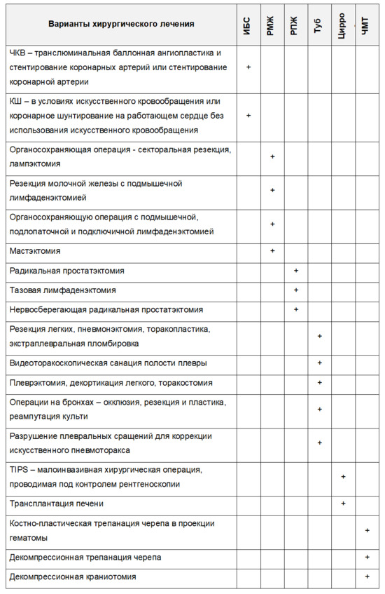 Знак + означает, что данный вариант может использоваться в алгоритме ИИ по выбору хирургического лечения при данном заболевании.