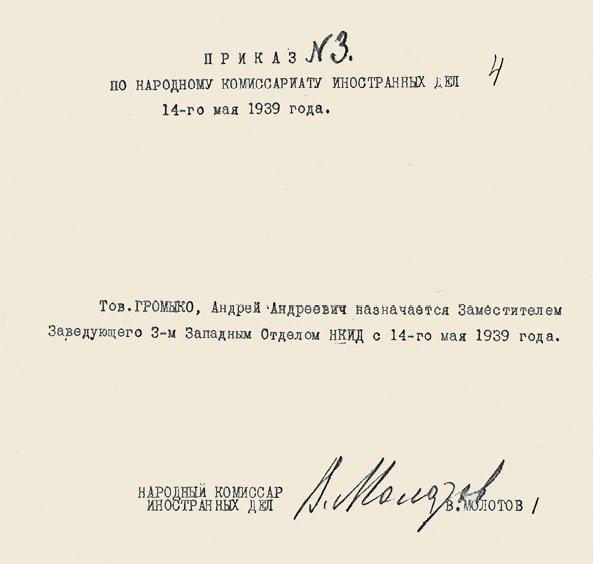 Приказ по НКИД СССР № 3 о назначении А.А. Громыко заместителем заведующего 3-м западным отделом НКИД СССР. 14 мая 1939