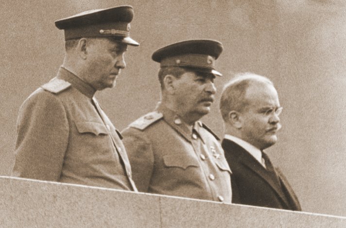 Н.А. Булганин, И.В. Сталин и В.М. Молотов на трибуне Мавзолея. 1946