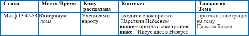 В данной притче описана стандартная процедура, которую проводили все израильские рыбаки. Согласно закону Моисея, чистой являлась только рыба, покрытая чешуей. Всех рыб и птиц, которые не были покрыты чешуей и перьями нужно было выбрасывать.