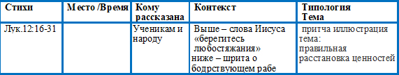 Несмотря на изобилие плодов, богач, не имея рассудительности, задается вопросом, куда ему их собрать. Его неразумность проявляется именно в том, что он не смог усмотреть истинное хранилище своих плодов и сокровищ.