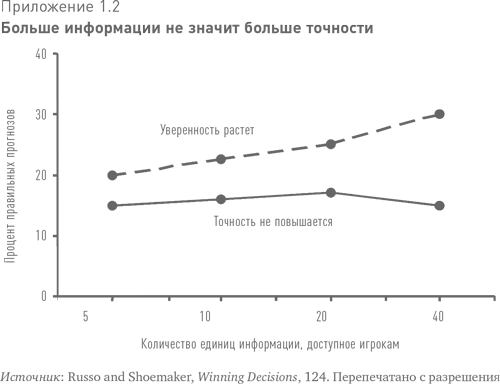 В качестве доказательства они провели исследование среди игроков на скачках. Сначала попросили игроков спрогнозировать результаты заездов на основе пяти единиц информации. Затем попросили сделать такие же прогнозы на основе 10, 20 и 40 единиц информации по каждой лошади. В приложении 1.2 графически представлены результаты: несмотря на незначительное улучшение точности, уверенность игроков в своих прогнозах резко возрастала вместе с увеличением количества данных13.