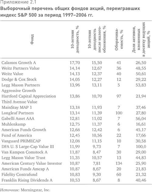 Разумеется, некоторые фонды активного управления превышают базовые индексы даже на длинных дистанциях. Чтобы узнать, можно ли выделить какие-либо общеприменимые принципы, позволяющие этим инвесторам добиваться такого успеха, мы провели исследование среди общих фондов акций, показавших доходность выше S&P 500 за 10-летний период, заканчивающийся 2006 г. Данные фонды имеют одного управляющего и активы более $1 млрд. (см. приложение 2.1)2.