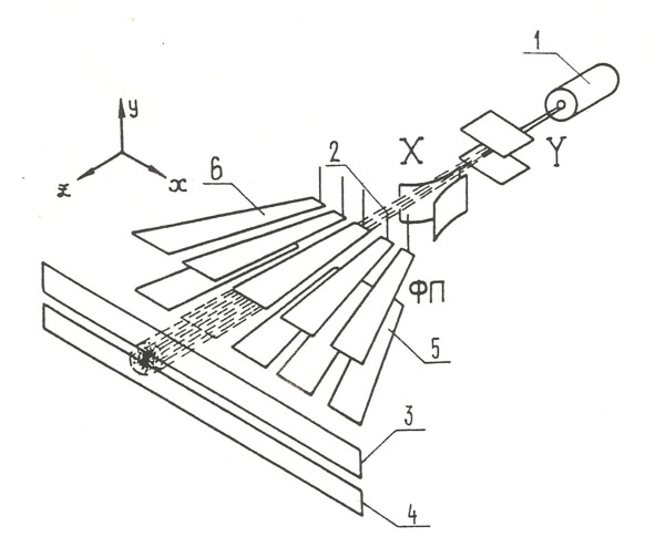 С помощью электронной пушки 1 создаётся несфокусированный пучок электронов 2. Пучок с помощью отклоняющих пластин X и Y направляется в зону функциональных пластин (ФП) 5, 6 и попадает одновременно на две коллекторные пластины 3, 4. Коллекторные пластины имеют корытообразную форму, исключающую рассеяние электронов за пределы этих пластин, и являются мишенями/детекторами электронов. В процессе движения пучка возникает бомбардировка электронами как самих коллекторных пластин, так и ФП, расположенных в непосредственной близости от пучка электронов. В результате такой бомбардировки возникают вторичные явления, которые можно разделить на две части: