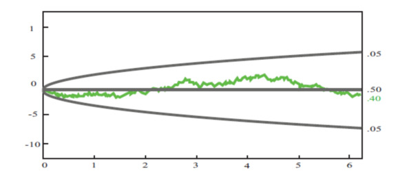 Прямая линия, по бокам которой симметрично идёт парабола, является теоретической линией математического ожидания. Верхняя и нижняя линии параболы соответствуют стандартному порогу значимости, за который принят уровень вероятности p = 0,05, то есть 1 к 20. Это означает, что в истинно случайном процессе лишь 5% случаев могут выйти за пределы одной из этих линий верхней и нижней парабол. Зелёная линия между ветвями параболы – это поток данных генератора случайных событий, состоящий из серии 1,2 млн бит. График оканчивается в хорошем соответствии с предсказаниями теории вероятности, расхождение составляет около 50 бит, в то время как для преодоления статистически значимого порога в 5% оно должно быть около 5000.