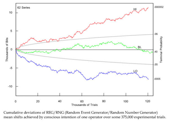 На рис.___ показан ещё график, демонстрирующий результаты одной из проведённых серий испытаний, когда применялось активное воздействие оператора на псилерон: оператор своим сознанием должен был создать намеренное отклонение от параболы вверх, вниз, или стремиться к параметрам базовой линии. На графике красная линия представляет собой совокупный результат испытаний, когда намерением операторов было воздействовать на поток данных «вверх» (High Intentions – HI, синяя – данные воздействия «вниз» (Low Intentions – LO), зелёная – данные воздействия по «базовой линии» (Base Line – BL). Зелёный график практически неотличим от калибровки или теоретического ожидания вероятности. Аналогичный анализ с учётом всего объёма данных, полученных PEAR, даёт вероятность менее, чем 1:1012 (один на триллион). Следует отметить, что средний зелёный график – это спокойная сглаженная синусоида. Средний график отражает нормальное состояние окружающего мира, фактически это график нормы. По мнению автора, к такой реакции и нужно стремиться при осознанной работе с псилероном, не к достижению резких скачков, пытаясь добиться аномальных результатов. Ставить задачу оператору сгенерировать ровную линию, быть максимально приближенным к базовой горизонтальной линии – тоже не есть разумно. Почему прямая линия или сильная сглаженность показаний синусоиды графика реакции – это так же плохо, как и резкие пики-скачки синусоиды? Прямая линия – это смерть, диагноз смерти, как это можно увидеть, например, на кардиограмме при остановке сердца. Сильные пики на кардиограмме можно трактовать как значительное увеличение нагрузки на систему или даже инфаркт, требующий немедленного принятия мер для нормирования ситуации, а просто горизонтальная линия – смерть системы. Прямой линии на графике не бывает, она не фиксировалась никогда, что говорит о фундаментальном явлении вечного волнового движения. Мир уничтожить нельзя, всегда будет волна – нормальная или аномальная, неизбежно возвращающаяся к норме.
