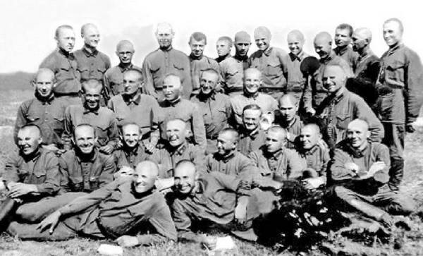 В центре слева. Н.П. Моисеенко на армейской переподготовке партийных работников. 1940 г.
