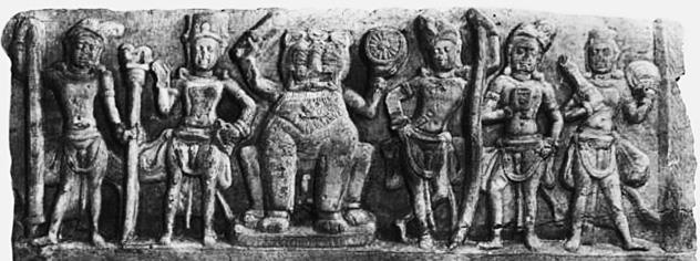 Пять героев Вришни вместе с Нарасимхой. Слева направо: Санкаршана, Васудева, человек-лев, Прадьюмна, Самба, Анируддха. Легендарные герои Вришни оставались популярными вплоть до V века, пока им на смену не пришли аватары Вишну.