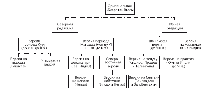 «Бхарата» дошла до нас в двух редакциях, северной и южной. Большинство современников знает её по «критическому изданию», подготовленному редакторами-индологами в Пуне на протяжении 1933–1970 гг. В ходе работы над разновозрастными рукописями редакторы выяснили, что северная редакция представляет собой исходный, едва ли не наивный текст (рис.). Южная редакция является поздним переработанным сочинением. Где-то в основе обеих редакций лежит оригинальная индоарийская поэма (Mahadevan, 2008). Это было короткое устное произведение о политической борьбе, славившее победы прошлого. Поэма включала описание традиций и легенд племенного объединения Куру, жившего до IX века до н. э. вдоль реки Ямуны, на территории Харьяна и Пенджаба.