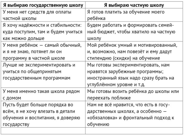 После общей информации о том, какими бывают современные государственные и частные школы, мы говорим о важных сторонах жизни школы, без понимания которых, ориентируясь только на рекламу и дни открытых дверей с яркими картинками, «фантиками и бантиками», родители не смогут сделать свой выбор. А дальше уже можно будет обсудить на семейном совете тот вариант обучения, систему, программу, которые вам больше всего понравились. Вы составите свой собственный wish list по школам и попробуете соотнести свой выбор с теми традициями, ценностями, которые характерны для вашей семьи.